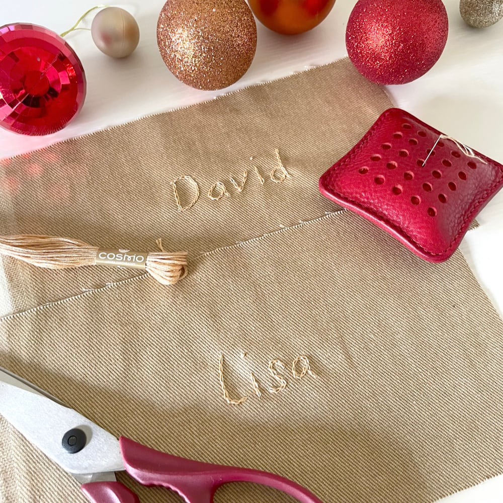 【オーダーメイドアイマスク】ご希望のお名前、文字を肌触りなめらかでやわらかいデニム生地にベージュの刺繍糸で丁寧に手刺繍させて頂きます。