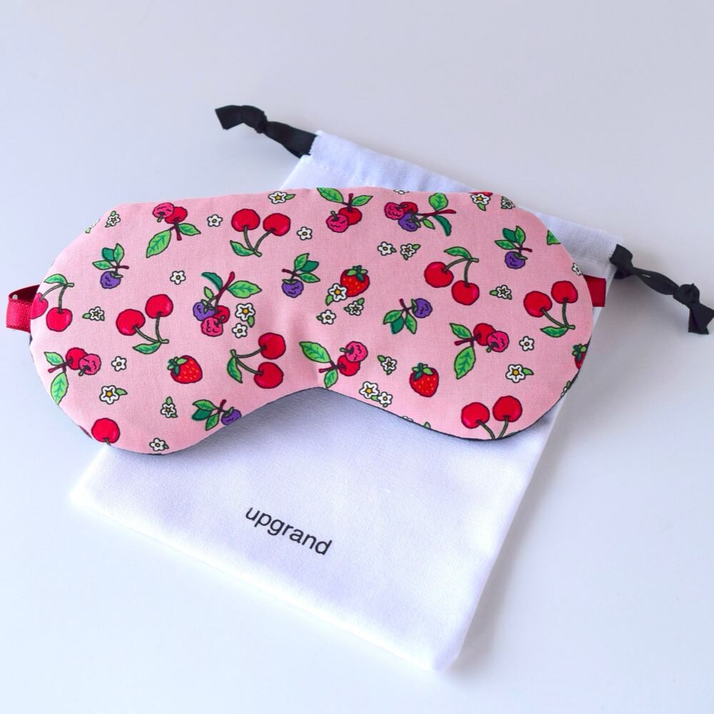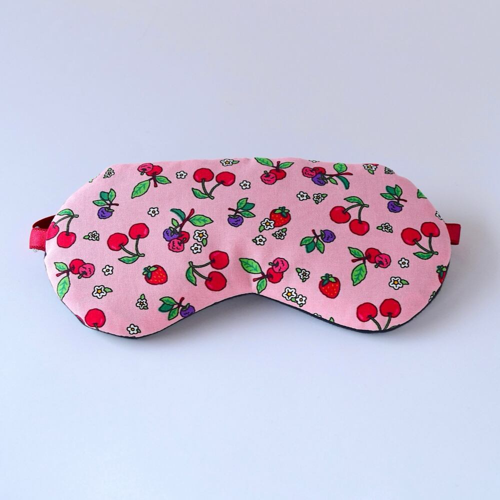 ストロベリーピンク地に、さくらんぼやイチゴなど可愛い果物がいっぱいのかわいいアイマスクです。